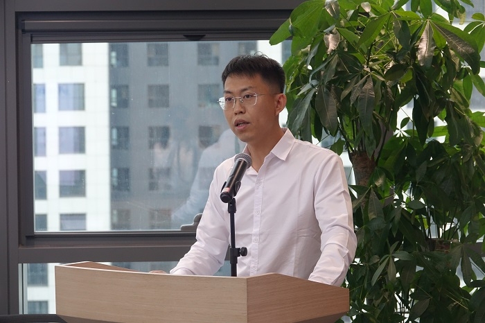 青年代表在北京通州區(qū)中倉街道黨工委慶祝中國共產(chǎn)黨成立104周年主題黨日活動上作主題宣講
